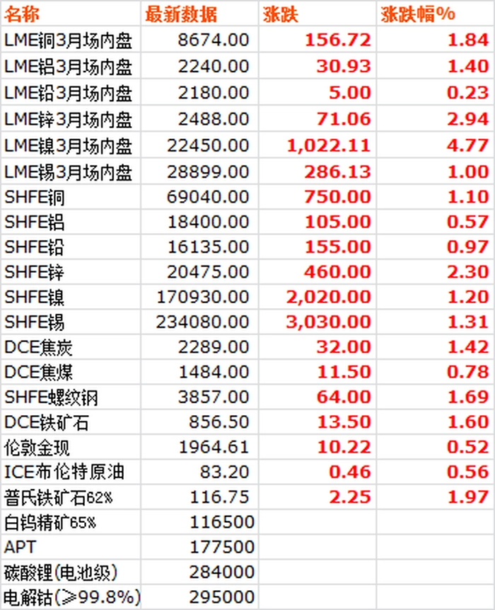 7月25日,LME六种基本金属价格延续周一全线上涨走势,高开高走高收,镍锌暴涨,铜铝大涨,铅锡小涨。三月期镍价继续领涨大盘,收于22450,上涨4.77%。三月期锌价收于2488,上涨2.94%。三月期铜价收于8674,上涨1.84%。三月期铝价收于2240,上涨1.4%。三月期锡价收于28899,上涨1%。三月期铅价收于2180,上涨0.23%。