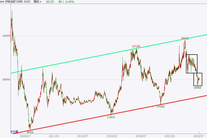 上半年,沪锌和伦锌价格持续下跌,沪锌由24800元/吨持续下跌至18600元/吨,跌幅25%;伦锌由3512美元/吨持续下跌至2215美元/吨,跌幅高达37%。6月至7月中旬,沪锌和伦锌价格低位震荡,沪锌价格在19500-20500元/吨窄幅震荡,伦锌在2300-2500美元/吨窄幅震荡。