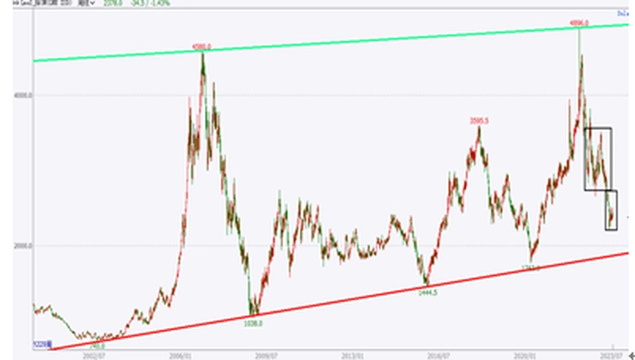 图4:沪锌和伦锌分别处在长期价格区间中部偏低位置和低位