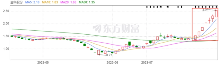 近日,金科股份7个交易日内录得5个涨停,累计涨幅为82.73%。如果从5月26日0.77元/股计算,两个月左右的时间,股价累计涨幅则达230%,成为A股市场近期涨幅最为凶猛的一只股票。