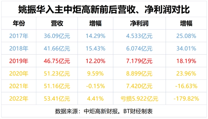 让人诟病的是,姚振华入主中炬高新以来,中炬高新的业绩惨淡。2019年姚振华成为中炬高新实际控制人,这一年中炬高新的营收为46.75亿元,同比增长12.20%;净利润7.179亿元,同比增长18.19%。而2018年中炬高新营收为41.66亿元,同比增长15.53%,净利润同比增长34.01%。2017年,中炬高新的营收增幅为14.29%,净利润增幅为25.08%,真正掌控中炬高新后2020年营收51.23亿元,增幅跌至9.59%,但净利润创新新高,达8.899亿元。增幅为23.96%。随后两年营收增幅还出现负增长,净利润更均是负增长,尤其2022年同比增长达-179.82%。