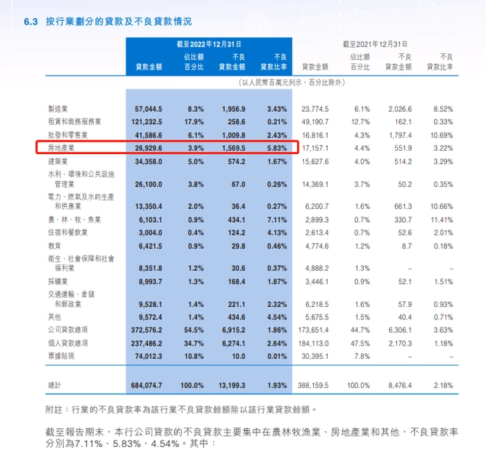 中原银行的地产风险敞口究竟有多大?2022年报显示,中原银行房地产业总贷款金额达到269.3亿元,其中不良贷款余额较上年末增加10.2亿元,至15.7亿元;不良贷款率增加2.61个百分点,至5.83%。中原银行对此在年报中解释称,主要由于吸收合并的机构涉房业务占比较高,且房地产业延续萧条,销售困难致房企还款能力减弱。