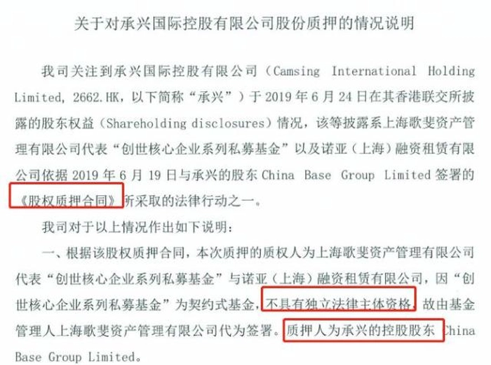 2019年7月8日,港股上市公司承兴国际控股又一次在半小时股价跌幅达90%,当日收跌超80%。而这件事又和诺亚财富有关,据联交所官网显示,歌斐资产、上海诺亚投资管理有限公司、创世核心企业系列私募基金、诺亚(上海)融资租赁有限公司出现在承兴国际控股大股东一栏,持股比例为62.84%。有意思的是,这是承兴国际控股实控人罗静被抓的前一天才完成股权变更。但这次变更并非股权转让,而是股权质押。