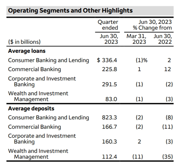 细分看贷款部分,消费者信贷(Consumer Banking and Lending)、商业银行(Commercial Banking)、企业和投资银行业务(Corporate and Investment Banking)、财富资管(Wealth and Investment Management)四个分项的二季度期内平均额度均与一季度环比基本持平,但同比来看,商业银行项目贷款较去年同期有显著增长,但企业和投行、财富资管业务出现下滑。