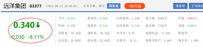 资本市场被此消息震惊,当日远洋港股股价下跌5.13%,次日再跌8.11%,截至8月15日收盘,远洋股价为0.34港元,总市值25.89亿港元,而远洋的股价巅峰时为13.076港元,总跌幅达97.4%,市值蒸发了970亿港元。