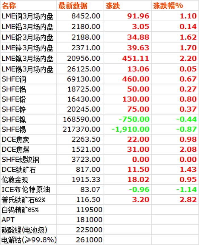 8月23日,LME六种基本金属价格全线上涨,高开高走高收,镍锌铅涨幅居前。三月期镍价继续领涨大盘,收于20956,上涨2.2%。三月期锌价收于2371,上涨1.7%。三月期铅价收于2188,上涨1.62%。三月期铜价收于8452,上涨1.1%。三月期铝价收于2180,上涨0.14%。三月期锡价收于26125,上涨0.05%。