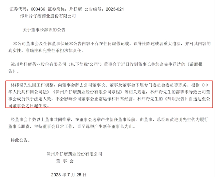 董事长被调查,片仔癀进入前所未有的动荡期,今年7月25日片仔癀发布公告称,林纬奇因工作调整辞去董事长一职,林志辉接任片仔癀董事长。近一年来,片仔癀已经有9位高管先后离职。这样的高层变动,在A股上市公司中较为罕见。