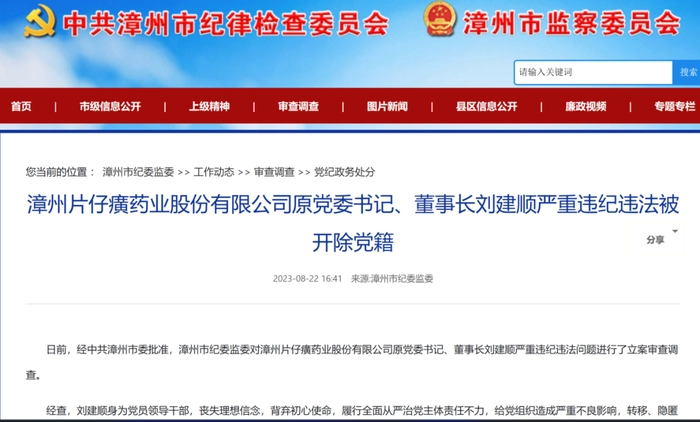 8月22日,漳州市纪委监委官网披露,片仔癀药业股份有限公司(以下简称片仔癀)原党委书记、董事长刘建顺严重违纪违法被开除党籍并立案审查。在片仔癀中报发布三天后刘建顺被查,引发市场广泛关注。