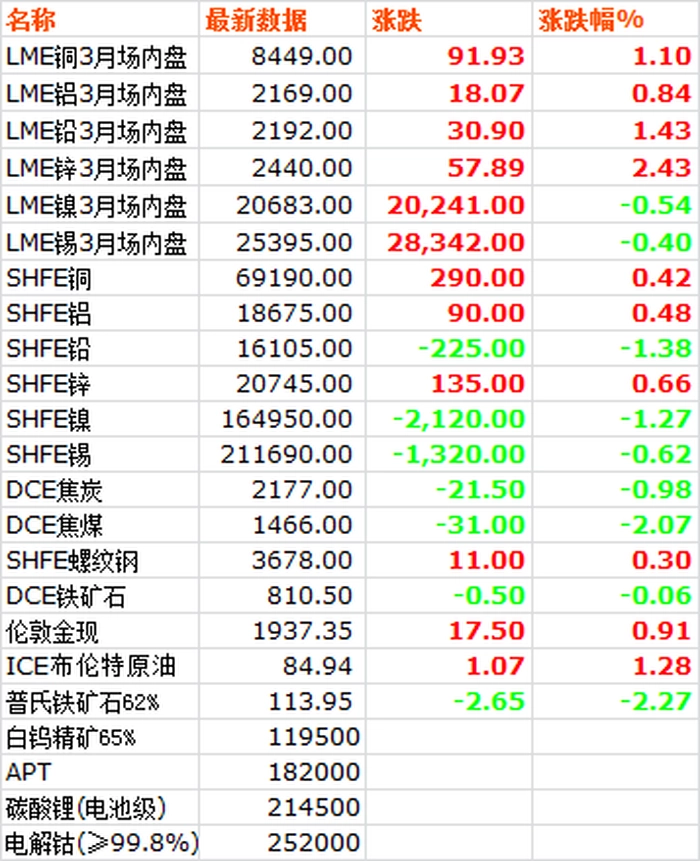 8月29日,LME六种基本金属价格涨多跌少,镍锡下跌,其它金属上涨,低开高走高收。三月期镍价收于20683,下跌0.54%。三月期锡价收于25395,下跌0.4%。三月期锌价领涨大盘,收于2440,上涨2.43%。三月期铅价收于2192,上涨1.43%。三月期铜价收于8449,上涨1.1%。三月期铝价收于2169,上涨0.84%。