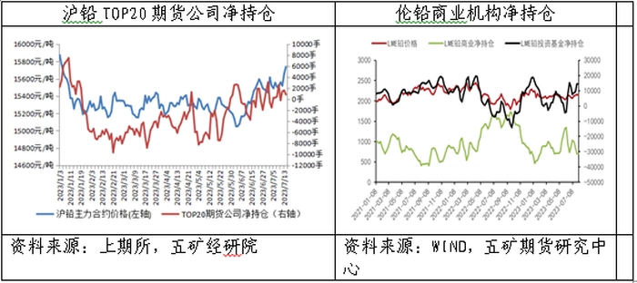 8月15日,沪铅持仓量TOP20期货公司持有净多头由上月同期839手增至3234手。伴随铅价逐渐逼近震荡区间上沿,国内主力操作策略由顺势交易重回“高抛低吸”,反映国内主力认为价格延续震荡运行概率较高。8月11日,伦铅商业机构持有净空头30082手,较上月同期空头敞口增加6514手,投资基金持有净多头12559手,较上月同期多头敞口扩大3779手。