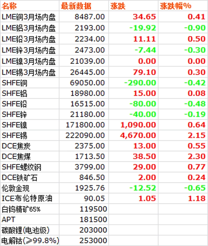 9月5日,LME六种基本金属价格涨跌互现,铝锌小幅下跌,镍持平,铅铜锡小幅上涨。三月期铝价领涨大盘,收于2193,下跌0.9%。三月期锌价收于2473,下跌0.3%。三月期镍价收于21039,持平。三月期铅价收于2234,上涨0.5%。三月期铜价继续高位窄幅拉锯后收于8487,上涨0.41%。三月期锡价收于26445,上涨0.3%。