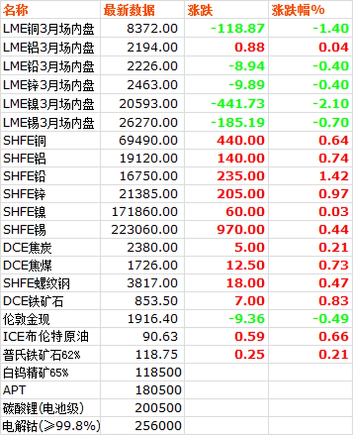 9月6日,LME六种基本金属价格除铝外普遍下跌,高开低走低收,镍铜跌幅居前。三月期镍价领跌大盘,收于20593,下跌2.1%。三月期铜价收于8372,下跌1.4%。三月期锡价收于26270,下跌0.7%。三月期锌价收于2463,下跌0.4%。三月期铅价收于2226,下跌0.4%。三月期铝价收于2194,上涨0.04%。