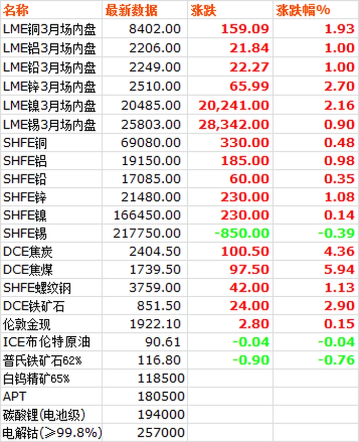 9月11日,LME六种基本金属价格全线上涨,低开高走高收,锌镍铜涨幅居前。三月期锌价领涨大盘,收于2510,上涨2.7%。三月期镍价收于20485,上涨2.16%。三月期铜价收于8402,上涨1.93%。三月期铝价收于2206,上涨1%。三月期铅价收于2249,上涨1%。三月期锡价收于25803,上涨0.9%。