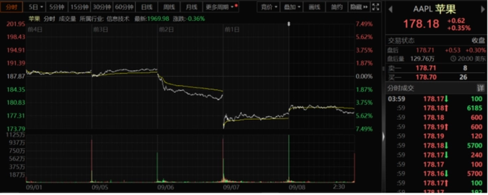 这一切都是因为那个企业回来了。自从Mate60 Pro上市后,长期占据热搜榜首,订单量已达2000多万台,其中受伤最深的莫过于苹果。这从股价就能窥见一斑,苹果自7月31日股价达到197.99美元的高点后就一直跌跌不休,总跌幅超过10%,市值蒸发达3096亿美元。