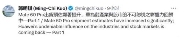 知名分析师郭明錤发布报告显示,Mate60 Pro手机有强劲的需求,“遥遥领先公司”对产业的影响力正在回归中。Mate60 Pro在发售的1年内,手机出货量有望达到1200万台。这一数据明显保守,据了解,在Mate60 Pro发售当日订单量就突破1700万台。