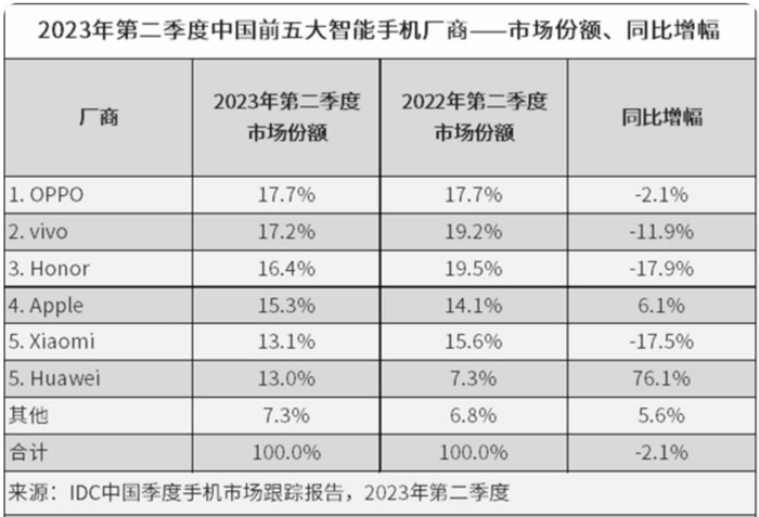 在2023年上半年的市场份额调查中,IDC数据显示,苹果在前两个季度的市场份额分别为14.1%和15.3%,第二季度相比第一季度的市场份额增加了1.2个百分点。同期“遥遥领先公司”的市场份额分别为7.3%和13%,第二季度增长了5.7个百分点。