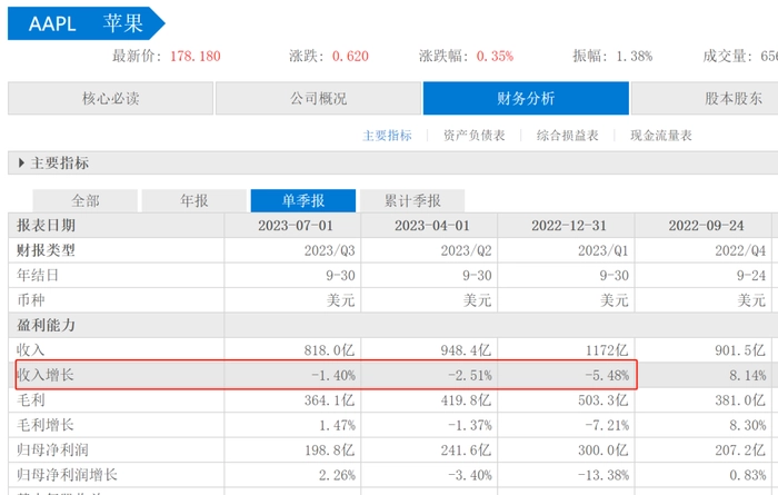 值得一提的是,苹果连续三个季度营收实现负增长,此前两个季度营收分别下滑了5.48%和2.51%,自2016年以来,苹果首次出现连续三个季度营收负增长。2021年四个季度,苹果实现了营收高增长,四个季度的营收增幅分别为21.37%、53.63%、36.44%和28.84%。但2022年四个季度的营收增幅明显放缓,分别增长了11.22%、8.59%、1.87%和8.14%。随后进入2023年三个财季都出现了负增长。