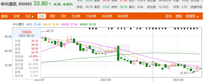 受惠于生成式大模型的火爆,算力板块终于走出结构性的牛市,即便在中兴业绩增长不尽如人意的情况下,中兴中报发布后仅录得两个小幅下滑,随即出现5%的大涨,往前看的则是去年10月初至今年7月初,中兴通讯股价涨幅超过了120%。但在中报发布后其股价波动较大,整体呈下滑趋势。