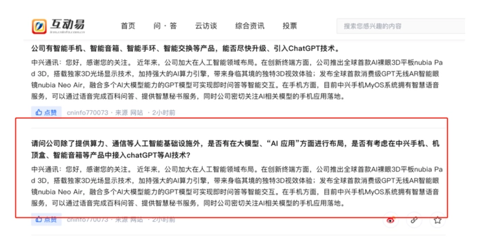 中兴在投资者互动平台上表示,中兴已经加大在人工智能领域布局。推出全球首款AI裸眼3D平板nubia Pad3D,搭载独家3D光场显示技术,加持强大的AI算力引擎,带来身临其境的独特3D视效体验;发布全球首款消费级GPT无线AR智能眼镜nubia Neo Air,融合多个AI大模型能力的GPT模型可实现即时问答等智能交互。