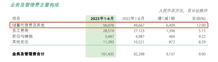 细看邮储银行财报,在业务及管理费中,有一项名为“储蓄代理费及其他”的支出,2023年上半年同比增长12.9%至560.87亿元。
