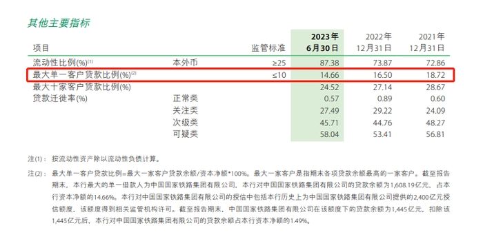 其二则体现在结构方面。2023年中报里,邮储银行披露最大单一客户贷款比例高达14.66%,显著高于监管“不高于10%”的要求。但向好的一面是,该指标近年来已经逐步压降。财报亦披露,上述最大贷款客户为中国国家铁路集团有限公司。