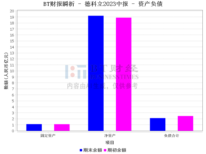 根据德科立2023年中报,资产总计期末余额为21.33亿元,略低于期初的21.36亿元。负债合计期末余额为2.12亿元,较期初的2.47亿元有所下降。净资产期末余额为19.21亿元,较期初的18.89亿元有所增加。资产负债率期末为9.93%,较期初的11.56%有所下降,显示出公司负债结构的优化。