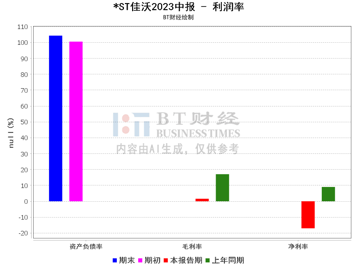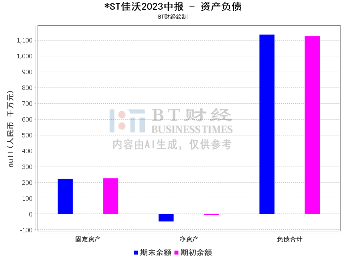 从资产和负债的角度来看,*ST佳沃的资产总计从期初的1.12百亿元减少到期末的1.09百亿元,负债合计从期初的1.13百亿元增加到期末的1.14百亿元。商誉从期初的4.8千万元增加到期末的4.88千万元。净资产从期初的-6.37千万元减少到期末的-4.73亿元。资产负债率从期初的100.57%增加到期末的104.35%。