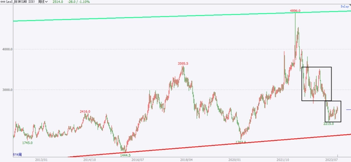 四、沪锌和伦锌分别处在长期价格区间中部偏低位置和低位