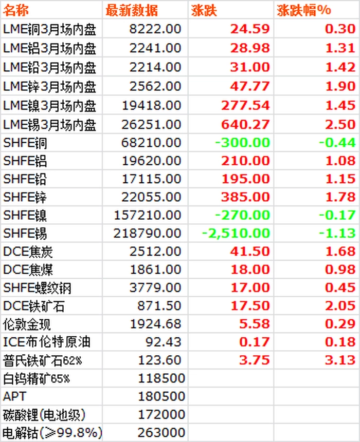 9月22日,LME六种基本金属价格全线上涨,低开高走高收,锡锌镍涨幅居前。三月期锡价领涨大盘,收于26251,上涨2.5%。三月期镍价收于19418,上涨1.54%。三月期锌价收于2562,上涨1.91%。三月期铝价收于2241,上涨1.31%。三月期铅价收于2214,上涨1.42%。三月期铜价收于8222,上涨0.34%。