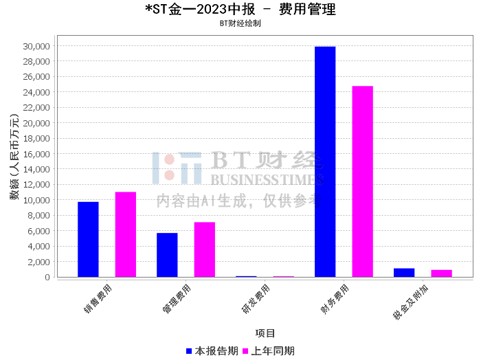*ST金一(股票代码:002721)是一家专注于贵金属工艺品和黄金珠宝的研发设计、生产加工和销售的公司。在2023年中报中,公司的营业收入同比减少9.55%,营业成本同比减少11.51%,销售费用同比减少11.64%,管理费用同比减少19.79%,财务费用同比增加20.71%,所得税费用同比减少97.32%,研发投入同比减少29.75%。这些数据反映出公司在报告期内的运营状况。