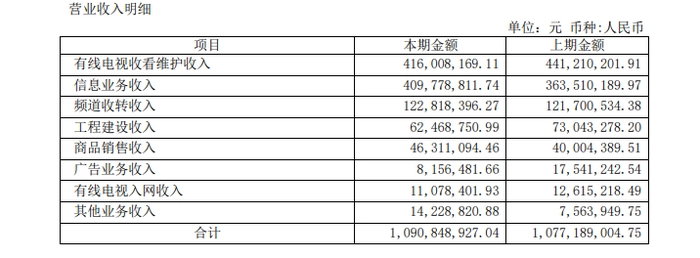 从业务构成情况来看,歌华有线的业务发展方向十分专一, 2023年半年报数据显示,歌华有线有线电视收看维护收入为4.16亿元,同比下滑5.71%;信息业务收入4.09亿元,同比上升12.36%;频道收转收入为1.23亿元,同比上升0.92%;工程建设收入6246.88万元,同比下滑14.48%;商品销售收入4631.11万元,同比上升15.77%;广告业务收入815.65万元,同比下滑53.5%;有线电视入网收入1107.84万元,同比下滑12.18%。其中有线电视收视维护业务收入和信息业务收入占营业收入的75.70%。