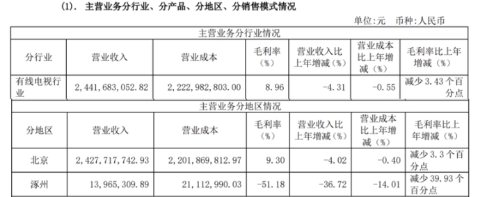 从2022年年度报告中可以看出,歌华有线业务集中在北京地区,全年营业收入为24.42亿元,北京地区营业收入为24.28亿元,约占营业收入总额的99.43%,主要负责北京市广播电视的网络建设、经营管理和运营维护,从事广播电视节目收转传送、网络信息服务、视频点播业务,及基于有线电视网的互联网接入服务、互联网数据传送增值业务等。