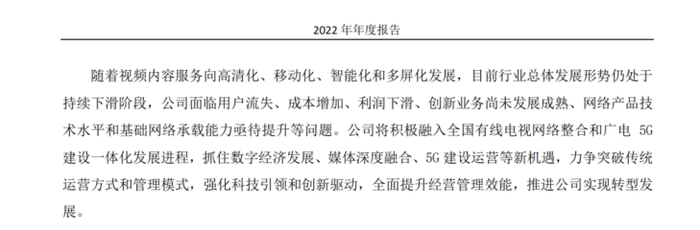 而“电视淘汰潮”的背后,首先受到影响的就是有线电视的运营商。在2022年年报“可能面对的风险”部分,歌华有线明确指出:“随着视频内容服务向高清化、移动化、智能化和多屏化发展,目前行业总体发展形势仍处于持续下滑阶段,公司面临用户流失、成本增加、利润下滑、创新业务尚未发展成熟、网络产品技术水平和基础网络承载能力亟待提升等问题。” 后续公司也将积极融入全国有线电视网络整合,持续推进广电5G建设一体化发展进程,希望可以通过转型扩展商业版图,谋求更好的发展前景。