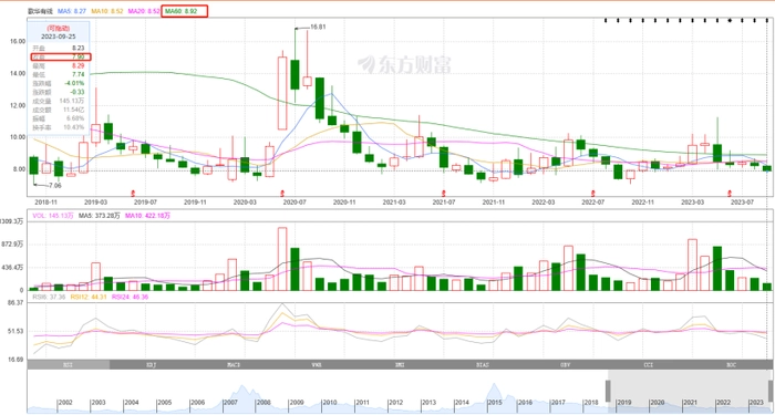 歌华有线认为,2023年中报业绩亏损的主要原因是,公司所持有的贵州省广播电视信息网络股份有限公司股权公允价值降幅较大,导致公司净利润下降。截至2023年8月底,中国广电网络股份有限公司为歌华有线控股股东,持股19.09%,北京北广传媒投资发展中心有限公司持股18.34%,中央汇金资产管理有限责任公司持股2.15%,东方明珠新媒体股份有限公司持股1.40%。截至2023年9月25日收盘,歌华有线总市值为110.0亿元,收盘价为7.9元,低于MA60(60日移动平均线)8.92元。
