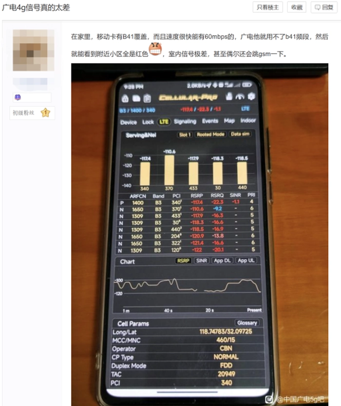 在中国广电5G贴吧中,就有大量用户反馈网络信号差甚至部分手机不支持使用广电卡的问题,其中回复率比较高的一个帖子在家中对移动、广电两个运营商的电话卡进行了网速监测,数据表明广电信号确实与移动存在差距,但2021年时中国广电与中国移动签署了5G共建共享合作,这一度被外界认为中国广电拥有了与中国移动同等质量的网络服务,从目前的用户的实际使用体验来看,似乎并不是如此。