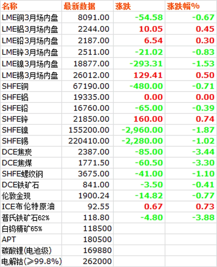 9月26日,LME六种基本金属价格窄幅拉锯后涨跌互现,铜锌镍小幅下跌,铝铅锡小幅上涨。三月期镍价继续领跌大盘,收于18877,下跌1.3%。三月期锌价收于2511,下跌0.83%。三月期铜价收于8091,下跌0.67%。三月期锡价收于26012,上涨0.5%。三月期铝价收于2244,上涨0.45%。三月期铅价收于2187,上涨0.3%。