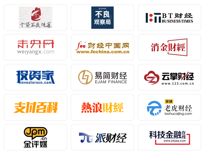 合作媒体:不良个贷观察、消金财经、环球老虎财经、BT财经、不良观察局(东岸科技旗下)、科技金融在线、投资家、云掌财经、财经中国网、未央网、简易财经、热浪财经、支付百科、金评媒、派财经等