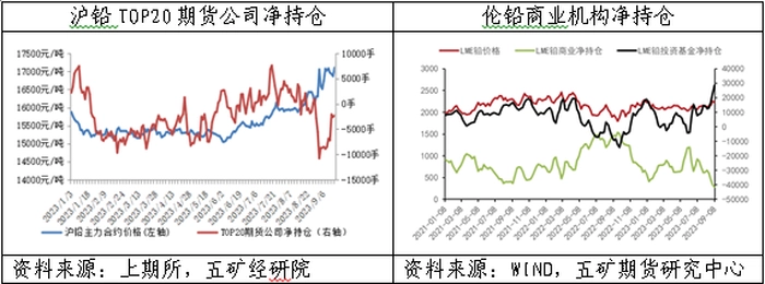 9月15日,沪铅持仓量TOP20期货公司持仓由上月同期净多头3234手转为净空头2292手,在铅价上涨逼近上方压力位时由多翻空,在价格向上成功突破后显著收缩空头敞口。9月8日,伦铅商业机构持有净空头41571手,较上月同期空头敞口增加11489手,投资基金持有净多头28548手,较上月同期多头敞口扩大15989手。