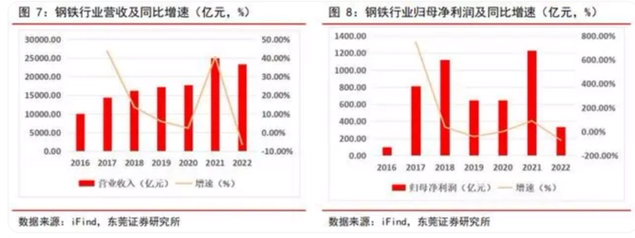 四家钢厂中只有鞍钢股份和河钢股份盈利,2022年鞍钢股份总营收为1311亿元,同比下滑了3.71%,归母净利润1.560亿元,同比上年的69.64亿元下滑了97.76%。虽然保住了归母净利润为正的颜面,但暴跌了近98%。河钢股份2022年总营收1435亿元,同比下滑4.11,%,归母净利润13.95亿元,同比下滑48.10%。无论是营收和净利润都出现了不同程度的下滑,尤其净利润下滑幅度之大远超营收下滑幅度。在东莞证券的研报中可以看出,2022年,钢铁行业无论是营收增幅还是归母净利润增幅均呈大幅下滑趋势。