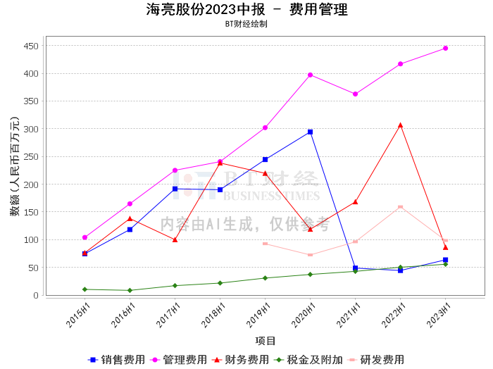 在2023年上半年,海亮股份实现了营业收入436.99亿元,同比增长14.87%。这一增长主要原因为报告期公司原材料贸易业务较上年同期增加所致。同时,公司的营业成本也同比增长15.43%,原因同样是原材料贸易业务的增加。销售费用同比增长43.54%,主要原因为报告期公司支付的业务佣金较上年同期增加所致。管理费用同比增长6.79%,主要原因为报告期公司的折旧费用及租赁费用较上年同期增加所致。财务费用同比减少71.94%,主要原因为报告期公司汇兑收益增加所致。所得税费用同比减少14.01%,主要原因为报告期公司应纳所得税减少所致。研发投入同比增长25.92%,主要原因为报告期公司项目增加研发投入所致。