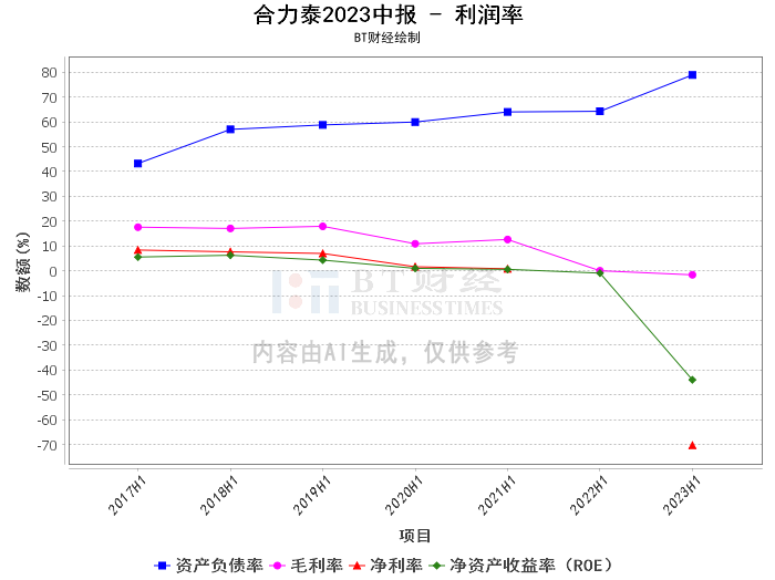 在盈利能力方面,合力泰的毛利率由上年同期的4.43%下降到本报告期的-1.64%,净利率由上年同期的-13.59%下降到本报告期的-70.3%,净资产收益率(ROE)为-43.94%。营业利润由上年同期的-9.99亿元下降到本报告期的-23.87亿元,净利润由上年同期的-8.49亿元下降到本报告期的-23.37亿元。