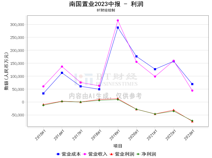 财务数据方面,南国置业2023年上半年的营业收入为4.44亿元,同比下降72.20%,主要受房地产项目开发周期的影响,本期可结转物业较上年同期减少。营业成本为6.94亿元,同比下降56.04%,原因同样是受房地产项目开发周期的影响。财务费用同比增加44.74%,主要原因为本期利息费用增加。所得税费用同比下降149.10%,主要原因为本期结利项目减少导致应纳所得税减少。