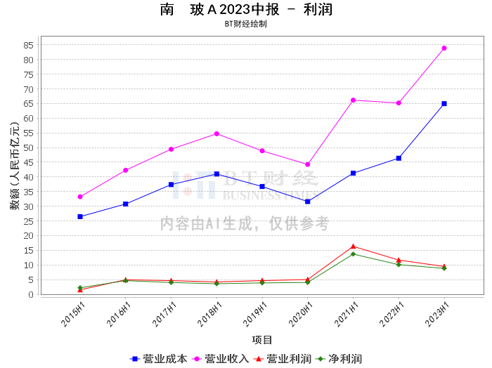 南玻A在2023年中报中,营业收入达到83.89亿元,相较于上年同期的65.19亿元有显著增长。营业利润为9.47亿元,虽然较上年同期的11.66亿元有所下降,但考虑到公司在光伏玻璃领域的投入,这是一个可以接受的结果。营业成本为64.95亿元,同比增加40.06%,主要原因是光伏玻璃产线投产收入增加带动成本增加。