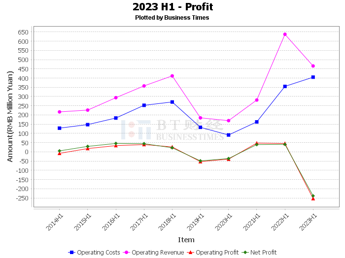 The company's operating income for this reporting period was 465 million yuan, a decrease from the same period last year's 637 million yuan. The operating profit was -253 million yuan, compared with 45.1 million yuan in the same period last year, the company's profitability has significantly declined. At the same time, the company's operating costs increased from 355 million yuan in the same period last year to 405 million yuan in this reporting period, which may be a significant reason for the decline in operating income.