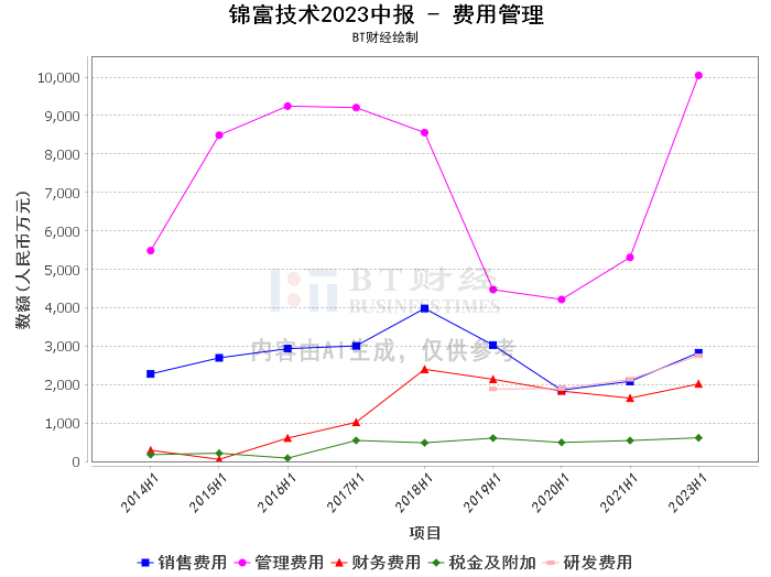 根据锦富技术2023年中报,公司的营业收入为6.47亿元,同比增长31.3%,主要系本期客户订单需求增加所致。营业成本为5.39亿元,同比增长32.75%,主要原因是营业收入增加,营业成本相应增长。管理费用同比增长44.8%,主要原因是本期对神洁环保合并资产评估增值计提折旧摊销,以及本期增加对迈致科技核心人员股权激励成本摊销。财务费用同比增长64.82%,主要是本期利息费用较上年同期增加所致。