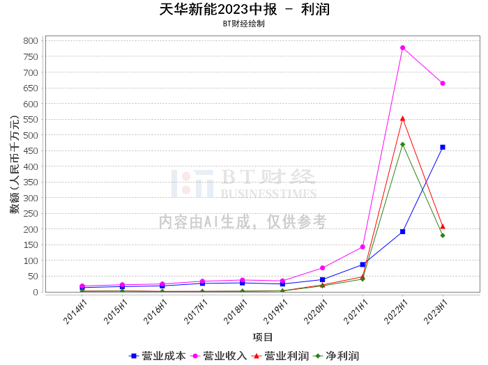 在2023年的中报中,天华新能的营业成本同比增加了140.59%,主要原因是报告期内锂精矿采购价格大幅提高,制造成本相应增高。财务费用同比增减为-423.24%,主要原因是报告期内利息收入大幅增长。所得税费用同比增减为-64.90%,主要原因是报告期内实现的利润总额下降,应纳税所得额相应减少。