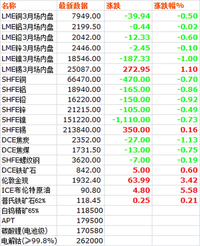10月13日,LME六种基本金属价格跌多涨少,仅锡上涨,镍领跌。三月期铜价先扬后抑,收于7949美元/吨,下跌0.5%。三月期铝价以震荡为主,收于2199.5美元/吨,下跌0.02%。三月期铅价收于2042美元/吨,下跌0.6%。三月期锌价区间震荡,收于2446美元/吨,下跌0.1%。三月期锡价收于25087美元/吨,上涨1.1%。三月期镍价收于18546美元/吨,下跌1.0%。