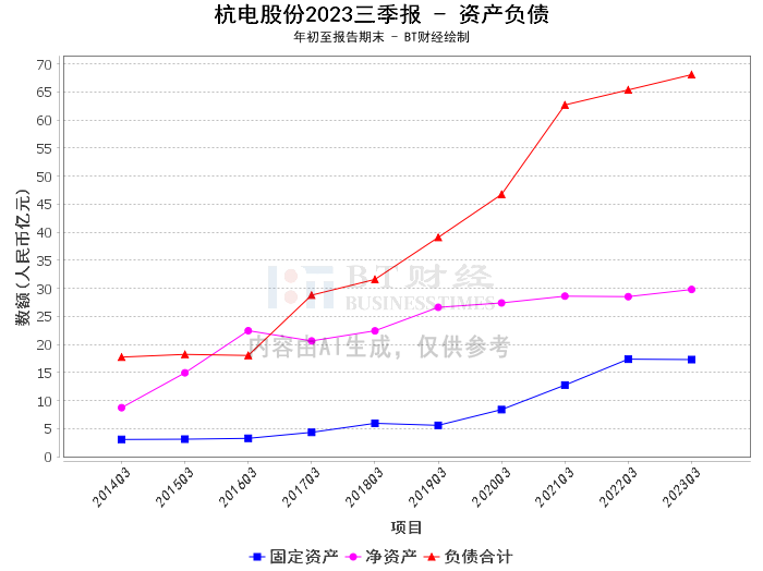 根据杭电股份2023年三季报,公司资产总计本报告期末97.89亿元,相比上年度末93.75亿元有所增长。负债合计本报告期末68.1亿元,上年度末为64.92亿元。净资产本报告期末为29.79亿元,上年度末为28.82亿元,净资产有所增长。资产负债率本报告期末为69.57%,略高于上年度末的69.25%。这表明公司的负债规模相对较大,但是净资产的增长也显示出公司的资产管理能力。