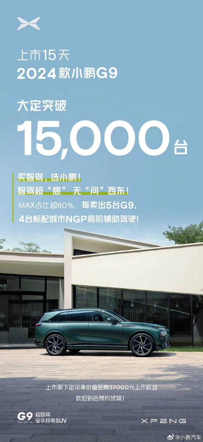 性价比的提升,立刻取得了效果,2024款小鹏G9上市后,15天大定突破15000台。在喜报上,小鹏汽车还打出:智驾超“想”、无“问”西东,似乎在向对手理想、问界喊话。