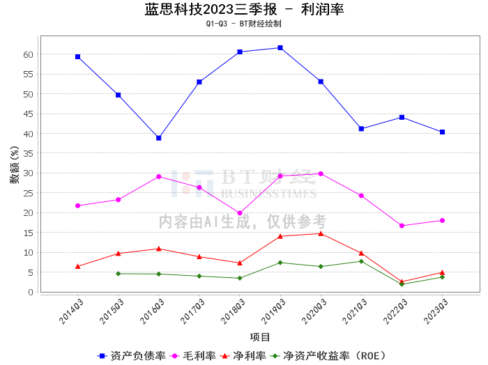 其次,从盈利能力来看,蓝思科技2023年三季度的毛利率为18.03%,较上年同期的16.7%有所提升,表明公司的盈利能力有所增强。净利率为4.91%,较上年同期的2.57%显著提高,显示出公司的净利润增长较快。净资产收益率(ROE)为3.71%,较上年度末的1.9%有所提升,这表明公司的盈利能力和资本运营效率有所提高。